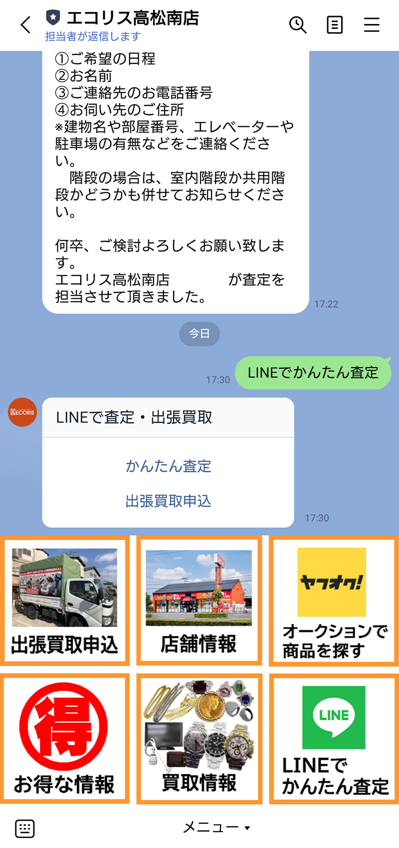 トーク画面右下の「LINEでかんたん査定」をタップ。「LINEでかんたん査定・出張買取」のメッセージが届いたら「かんたん査定」を